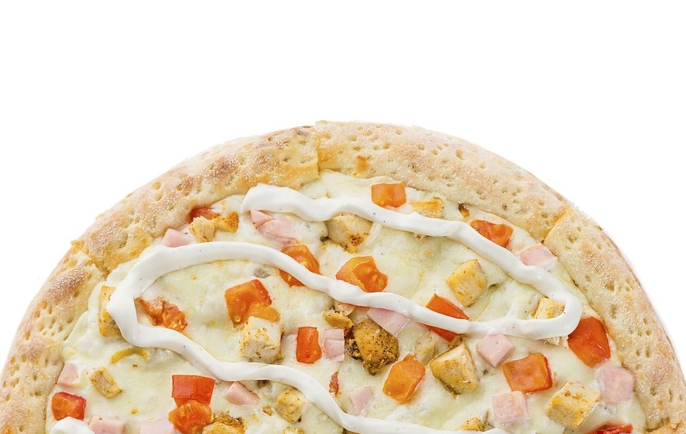 Чесночный соус ранч, сыр моцарелла, двойная порция сочного цыпленка, двойная порция ветчины из цыпленка, помидоры