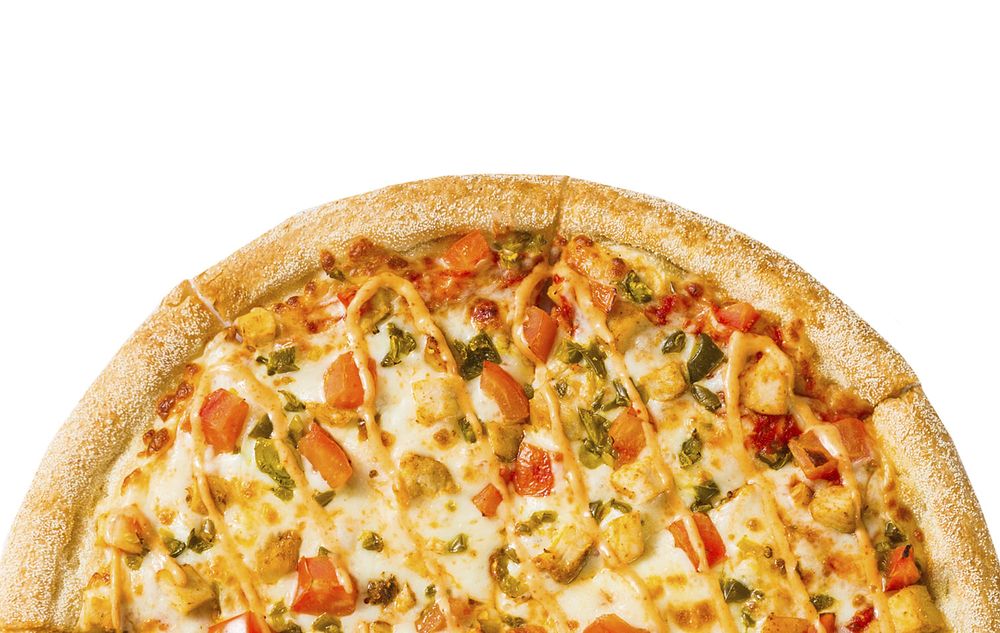 Итальянский пицца-соус из томатов, порция моцареллы, двойная порция сочного цыпленка, острые перчики халапеньо (острые), помидоры, соус спайси (острый)