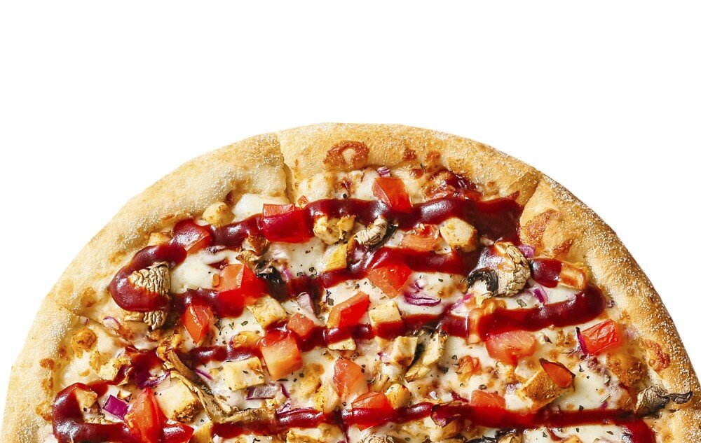 Соус барбекю, сыр моцарелла, двойная порция сочного цыпленка, красный лук, свежие шампиньоны, помидоры, базилик