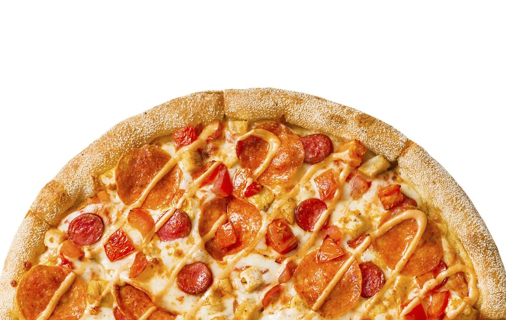 Итальянский пицца-соус из томатов, порци моцареллы, двойная порция сочного цыпленка, пепперони из говядины, охотничьи колбаски, помидоры, соус спайси