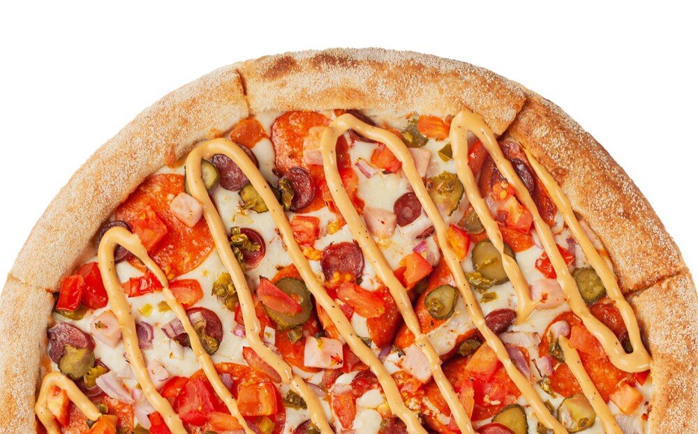 Итальяский пицца-соус из томатов, сыр моцарелла, пепперони из говядины, охотничьи колбаски, ветчина из цыпленка, лук красный, перчики халапеньо (острые), томаты, корнишоны, соус Биг Тейсти